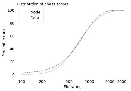If the distribution of chess skill is lognormal, and if Elo scores quantify this skill, we expect the distribution of Elo scores to be lognormal. To find out, I collected data from Chess.com, which is a popular internet chess server that hosts individual games and tournaments for players from all over the world. Their leader board shows the distribution of Elo ratings for almost six million players who have used their service. The following figure shows the distribution of these scores on a log scale, along with a lognormal model.