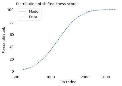 The lognormal model does not fit the data particularly well. But that might be misleading, because unlike running speeds, Elo scores have no natural zero point. The conventional zero point was chosen arbitrarily, which means we can shift it up or down without changing what the scores mean relative to each other.