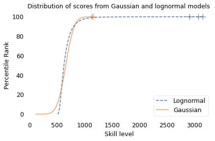 In the lognormal distribution, the top three scores are 2913, 3066, and 3155. They are clearly distinct in the figure and substantially different in practice. In this example, we expect the top player to beat #3 about 80% of the time.
