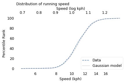 To demonstrate, I’ll use data from the James Joyce Ramble, which is the 10 kilometer race where I ran my previously-mentioned personal record time. I downloaded the times for the 1,592 finishers and converted them to speeds in kilometers per hour. The following figure shows the distribution of these speeds on a logarithmic scale, along with a Gaussian model I fit to the data.
